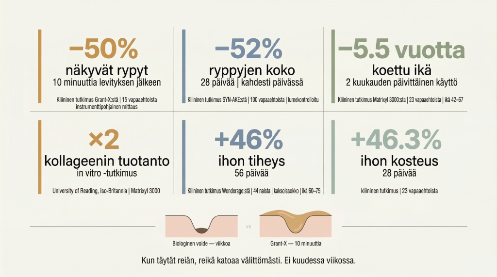 Mutta ajattele mekanismia. Emme puhu voiteesta, joka täytyy ensin imeyttää, metaboloida ja muuntaa uusiksi kollageenisäikeiksi. Puhumme polymeeristä, joka menee ryppyyn ja täyttää sen fyysisesti. Nopeus ei ole yllättävä — se on looginen seuraus lähestymistavasta, joka on fyysinen, ei biologinen.