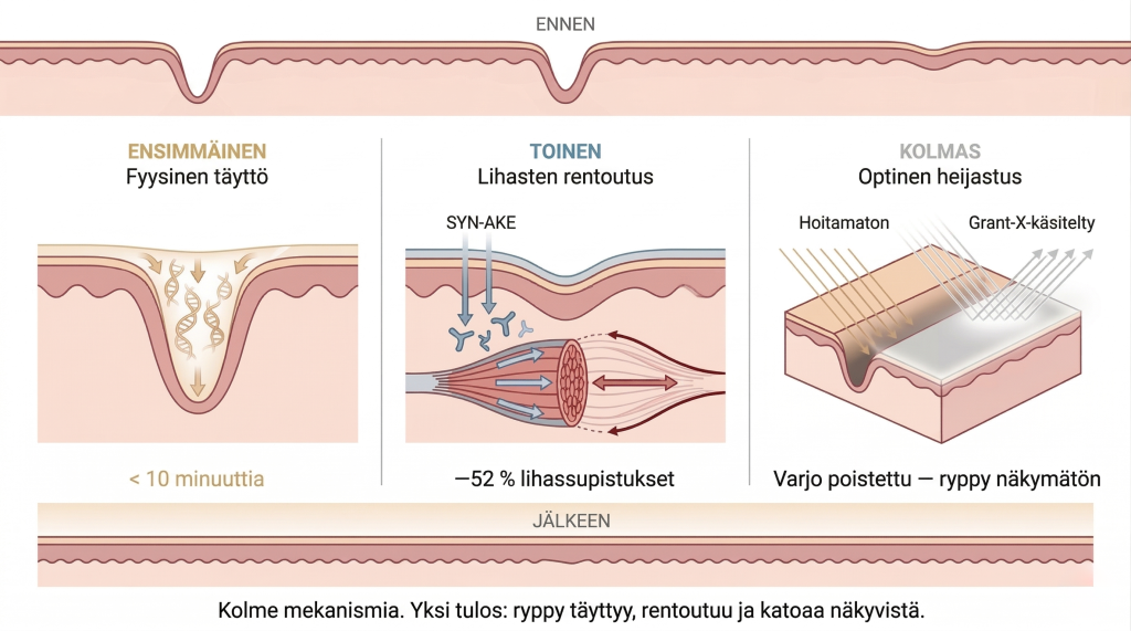 Kolme mekanismia. Yksi tulos: syvä ryppy täyttyy, rentoutuu ja katoaa näkyvistä.
